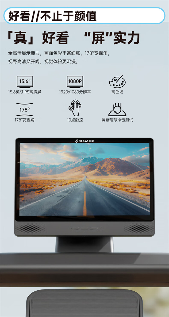 旺财28推荐健身器材-舒华商用电动跑步机SH-T6500拥有10.1寸IPS高清触摸屏、Z型动感时尚外观设计、70×150mm精钢立柱机身、F级高效静音马达、520mm商用豪华跑带和35mm双层全跑台减震跑板等优势,让您享受科学跑步。