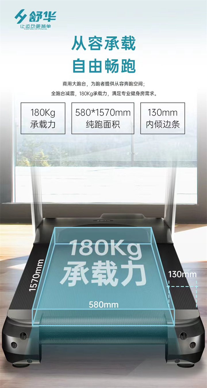 舒华商用跑步机SH-T8919采用t2.2mm黑钻纹(可选配:t2.4免维护跑带)的跑带,,选用手握心率测试 自带心率带及增加心率控速(HRC)程序模块、接触式心率感应测量心跳等数据,跑步面积达580×1570mm,可承受180kg的使用者使用。