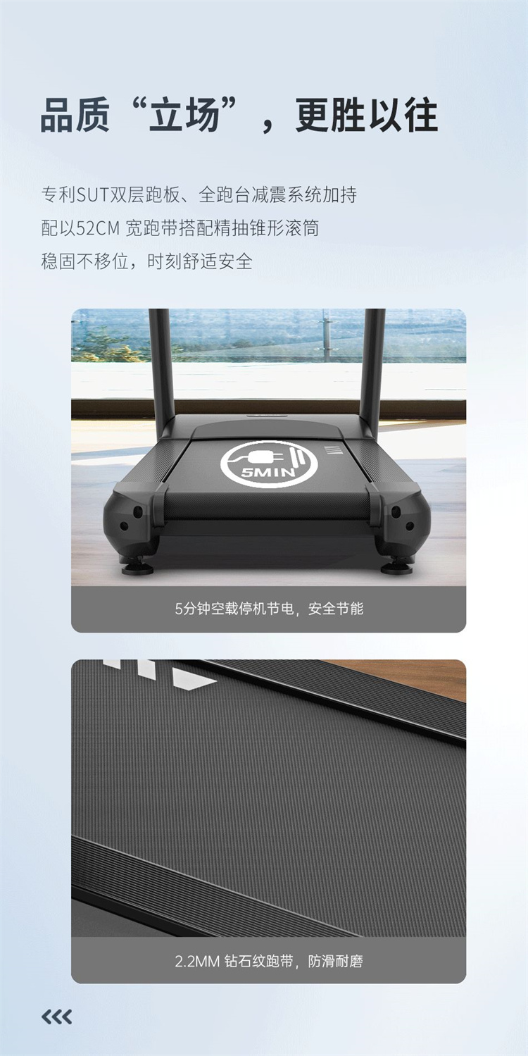 舒华家用跑步机SH-T6700(X6)采用18T+12T双层跑板,T2.2mm钻石纹的跑带,双层跑板全跑台减震,对您跑步中的膝盖进行全方位的呵护,选用接触式心率感应和无线心率感应等多种方式获取数据,跑步面积达520×1450mm,可承受130kg的使用者使用。